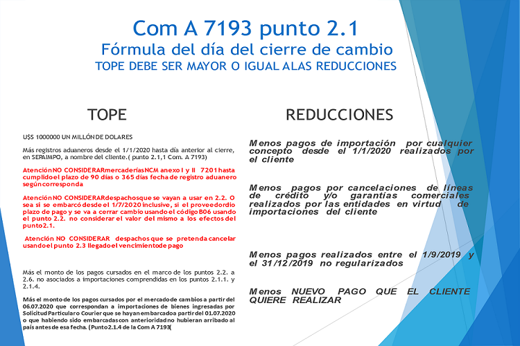 Las mencionadas modificaciones corresponden al punto 2.1.( se modifica 2.1.2 y se agrega 2.1.4, ambos relacionados con courrier y solicitudes particulares mejorando la forma de expresar la fórmula que da tope y cupo al importador para acceder al MLC por el punto 2.1)