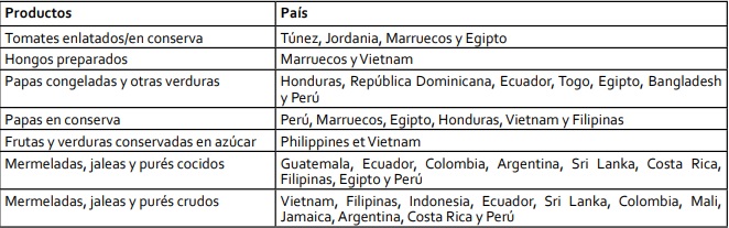 Los principales proveedores de frutas y verduras procesadas fueron, en orden descendente de valor, Estados Unidos (54 % del valor total en dólares), seguido de lejos por China (5 %) y México (5%)2 .